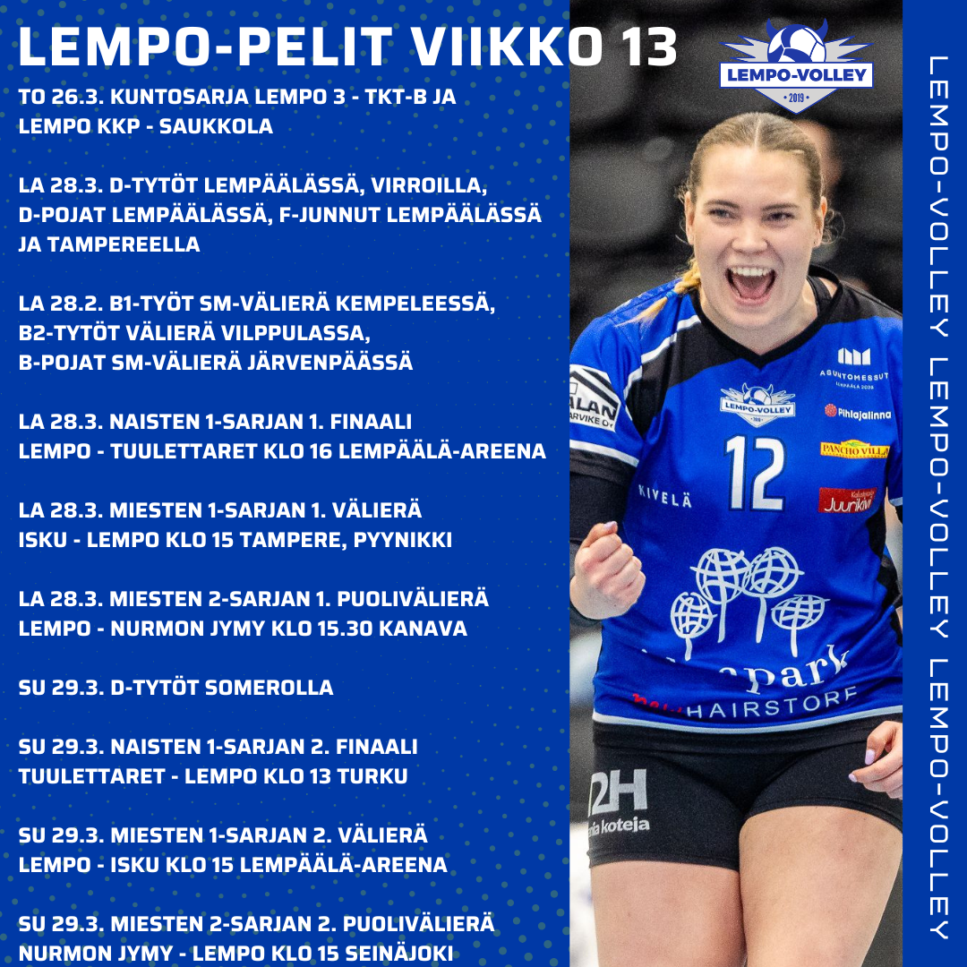 Maaliskuinen viikko on huikeaa lentopallotykitystä! Lempo pelaa naisten 1-sarjan finaalissa mestaruudesta, miesten 1-sarjassa Lempo on välierissä. B-tytöt ja B-pojat pelaavat paikasta SM-finaaleihin.…
