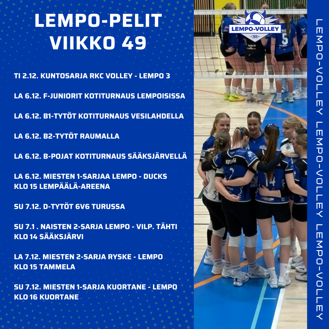 Lempo-Volleyn marraskuinen viikko tarjoaa paljon kotiturnauksia ja -pelejä. Viikko on A- ja D-junioreiden turnausviikko. Lauantaina 22. marraskuuta A2-pojat pelaa kotiturnauksen Sääksjärven…
