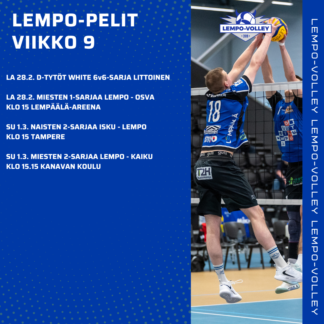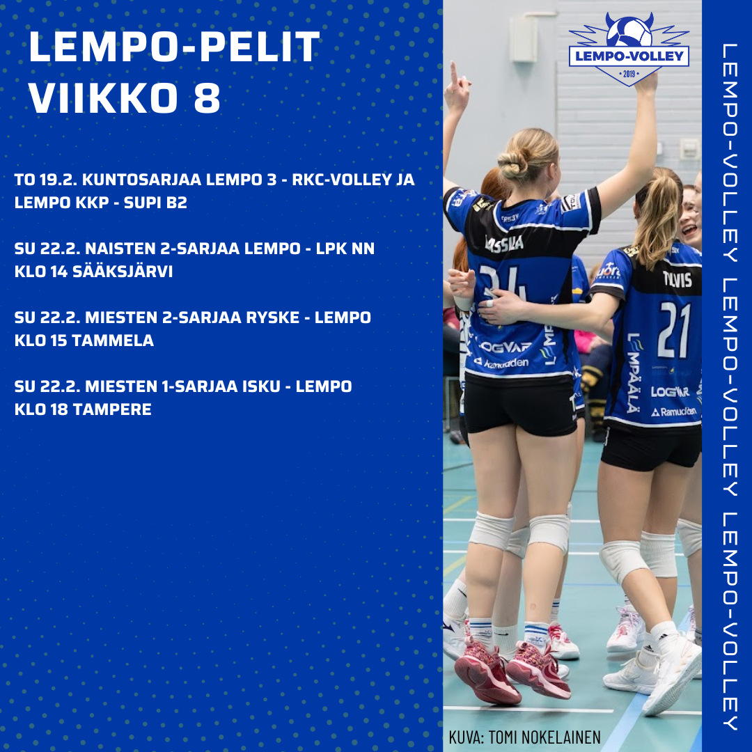 Lempo-Volleyn viikolla ei ole junioreiden otteluita alkavan talvilomaviikon myötä. Aikuisista pelaavat M1, 2-sarjat ja Kuntosarjat. Naisten 2-sarjalla on kotipeli sunnuntaina 22. helmikuuta, kun LP…