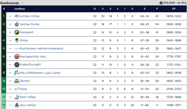 Su 14.12. Vantaa Duck–Lempo-Volley 0–3 (18–25, 23–25, 11–25). Tikkurilan urheilutalo, yleisö: 240