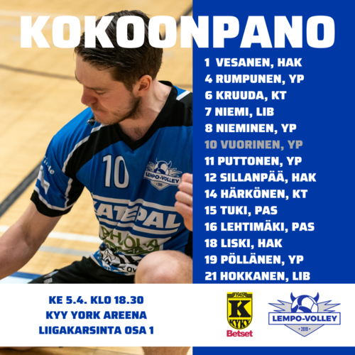 1-sarjan mestari Lempo-Volley aloitti lentopallon miesten Mestaruusliigan karsinnat keskiviikkona 5.4. Kyyjärvellä KyKy-Betsetin vieraana. Ensimmäisen kiinnityksen ensi kauden liigapaikkaan otti liigajoukkue KyKy-Betset erin 3–0 (25–10, 25–23, 25–22). Sarja jatkuu perjantaina Lempäälässä ja kolmella voitolla lunastaa liigapaikan.