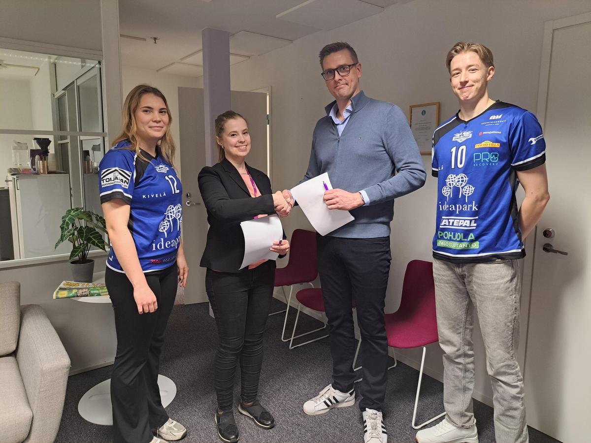 Kuvissa: Lempo-Volleyn puheenjohtaja Ossi Vesanen ja Annian yrittäjä Maria Puputti kättelivät sopimuksen kunniaksi, paikalla olivat myös Lempo-Volleyn edustusjoukkueiden kapteenit Tiia Virta ja Joel Itänen. Kapteenit vierailivat myös Annian pisteellä Ideparkin keskusaukiolla avajaistapahtumassa.