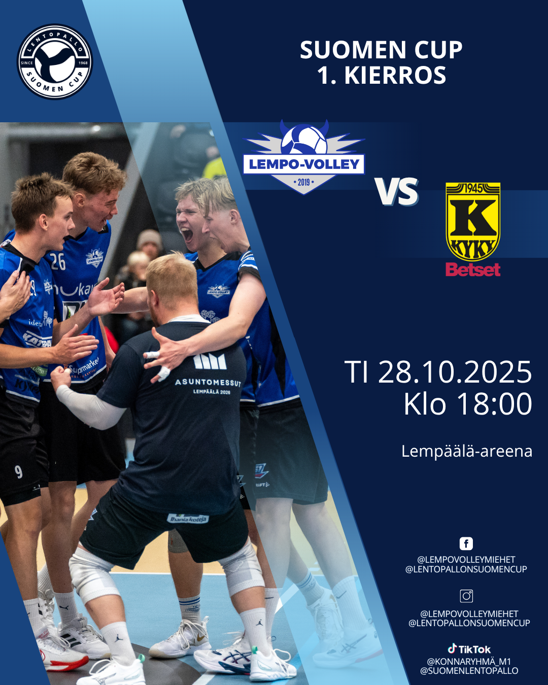 Lempo-Volleyn miesten 1-sarjajoukkue kohtaa liigajoukkue Kyyjärven Kyky-Betsetin. Peli on Lempon kotiottelu.