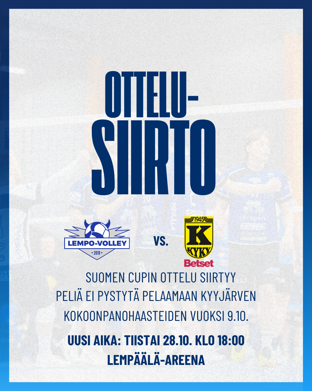 Lempo-Volleyn miesten 1-sarjajoukkueen Suomen Cupin 1. kierroksen ottelu Mestaruusliigaa pelaavaa Kyyjärven Kyky-Betsetiä vastaan joudutaan siirtämään. Ottelu oli alun perin tarkoitus pelata torstaina 9. lokakuuta kello 18 Lempäälä-areenassa, mutta peliä ei pystytä silloin pelaamaan.