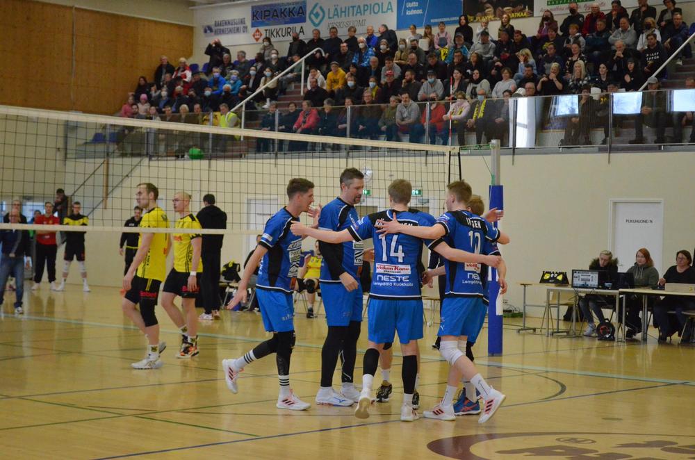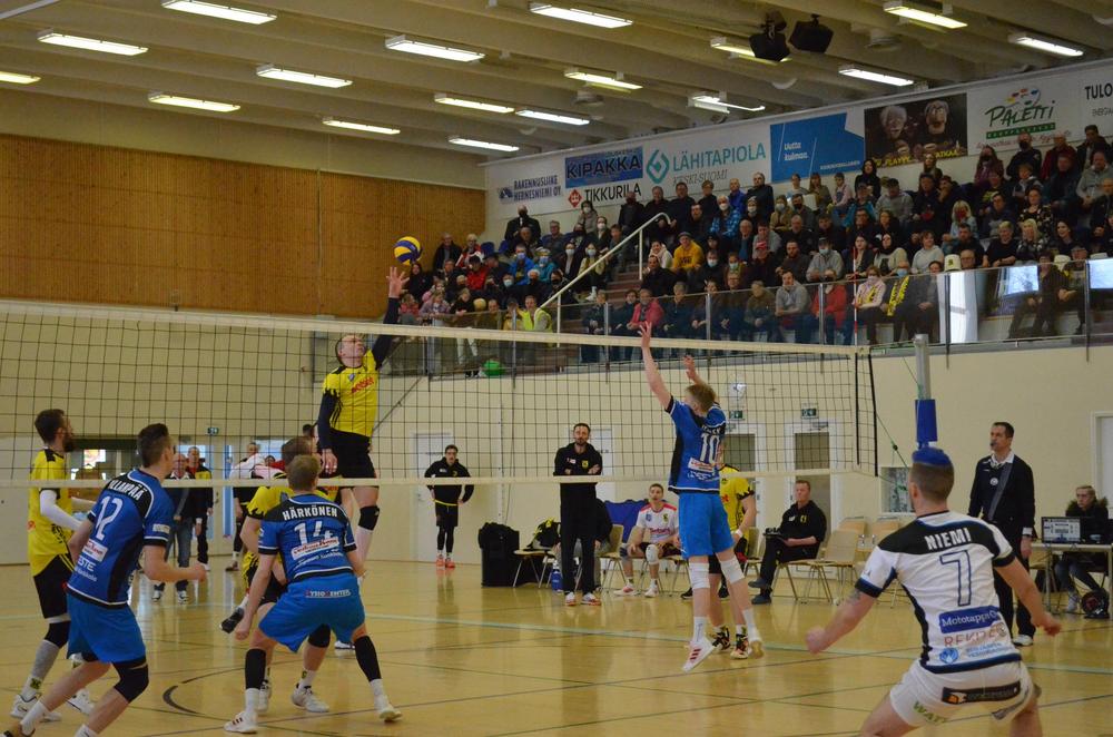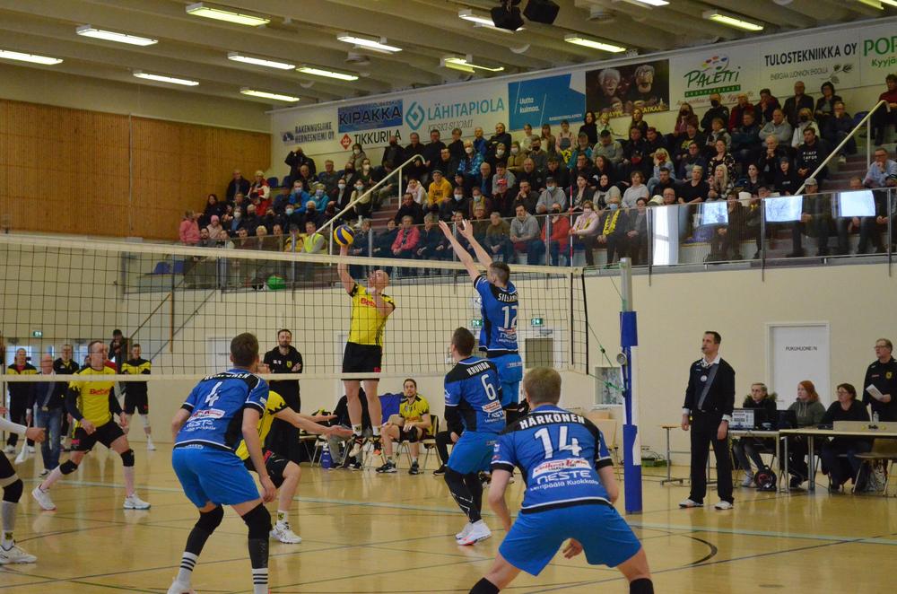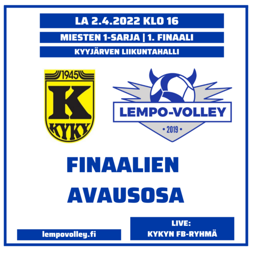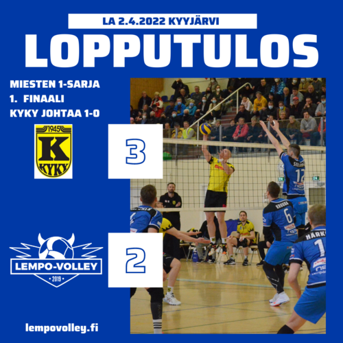 Miesten 1-sarjafinaalit aloitettiin lauantaina Kyyjärven Kykyn kotikentällä. Kuten arvata saattoi, ottelu venyi viidenteen erään. Sen ja koko pelin voitti Kyky ja loppuluvut kirjattiin avauskohtaamisesta 3–2 (21–25, 26–24, 25–21, 21–25, 16–14).