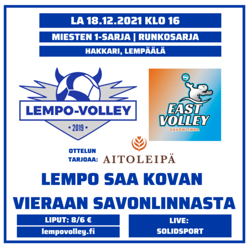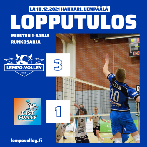Hakkarissa nähtiin vaikean alun jälkeen Lempo-Volleylta komea esitys syyskauden päätteeksi. East tuli peliin tuulispään lailla, mutta Lempon saatua pelinsä uomiinsa oli jälki komeaa ja Lempo otti voiton 3-1.