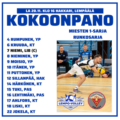 Isku: Niko Lintula, Tiitus Vuori, Siim Röömussaar, Paavo Korhonen, Daniel Heinonen, Antti Taponen ja libero Joni Veripää