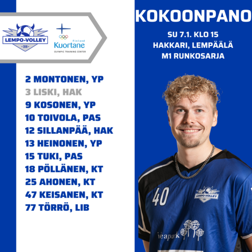 Lempo: Matti Toivola, Daniel Heinonen, Aaro Keisanen, Tuomas Sillanpää, Veeti Kosonen, Eetu Ahonen ja libero Jami Törrö