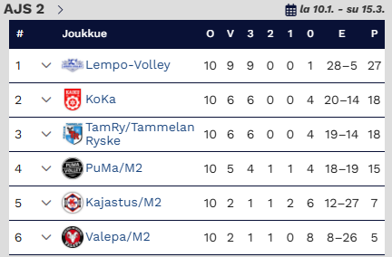 Su 22.3. Kauhavan Wisa–Lempo-Volley 1–3 (20–25, 25–23, 18–25, 25–16), Kauhavan koulukeskus