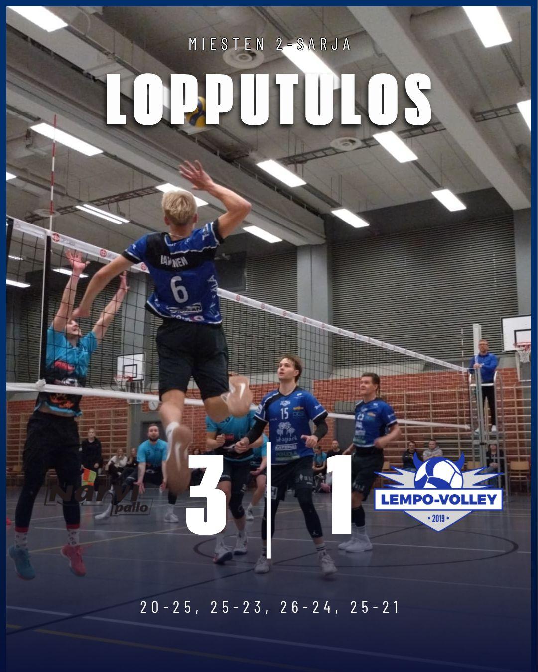 Kaksi todella tiukkaa erää ja kolmas selvemmin Lempolle. Lopputulos Lempo M2 - VaLePa M2 3-0 (26-24, 31-29, 25-15). Lempon Niko Syrillä härkäpäivä jo 23 pistettä.