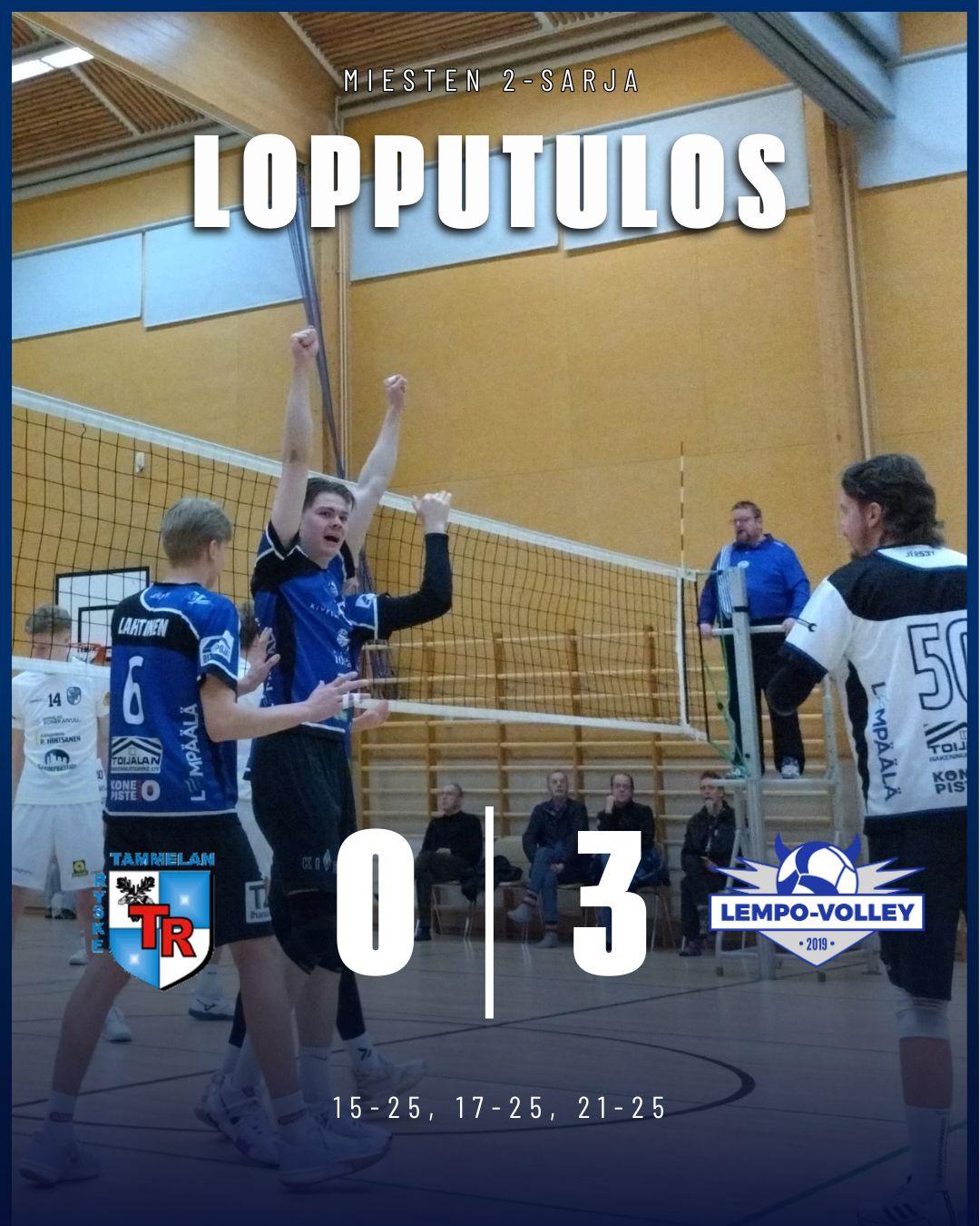 Lempo-Volley haki sunnuntaina 22. helmikuuta selvän vierasvoiton Tammelan Ryskeestä vieraskentällä 3-0 (25-15, 25-17, 25-21). Lempon saldo alemmassa jatkosarjassa nyt 7 pelistä 6 voittoa ja 18 pistettä. Jäljellä vielä kolme peliä.