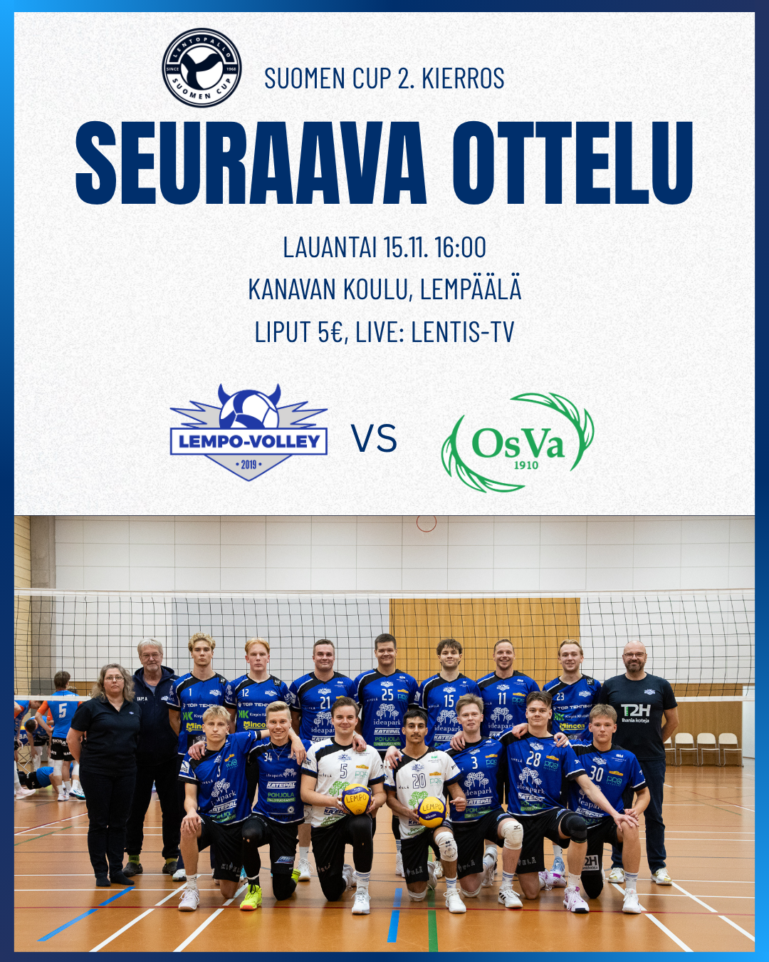 Lempo-Volleyn 2-sarjajoukkue jatkaa Suomen Cupissa viimeisenä Lempon joukkueena. 2. kierroksella vastaan tulee 1-sarjaa pelaava Oulunsalon Vasama. Isojen panoksien peli pelataan lauantaina 15. marraskuuta Lempon kotisalissa Kanavan koululla kello 16 alkaen. Voittaja etenee Suomen Cupissa kahdeksan joukkoon puolivälieriin.