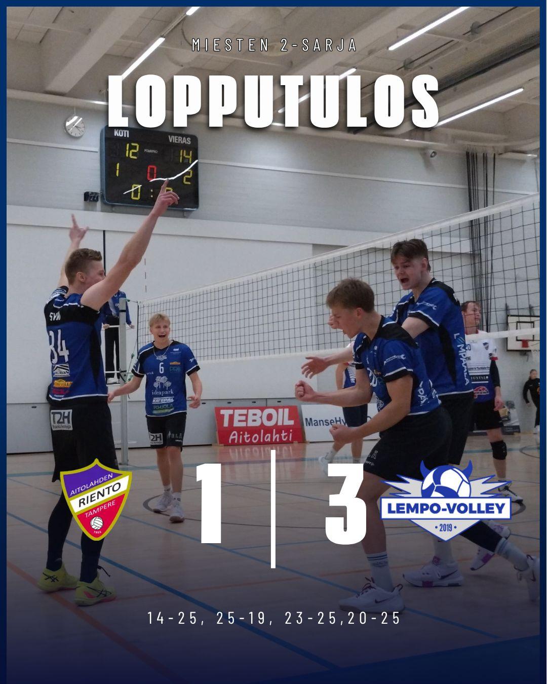 Lempo avaa voittotilinsä miesten 2-sarjassa sunnuntaina 19. lokakuuta Kaukajärven vapaa-aikatalossa Tampereella. Paikallispelissä tuli vierasvoitto Aitolahden Riennosta 3-1 (25-14, 19-25, 25-23, 25-23).