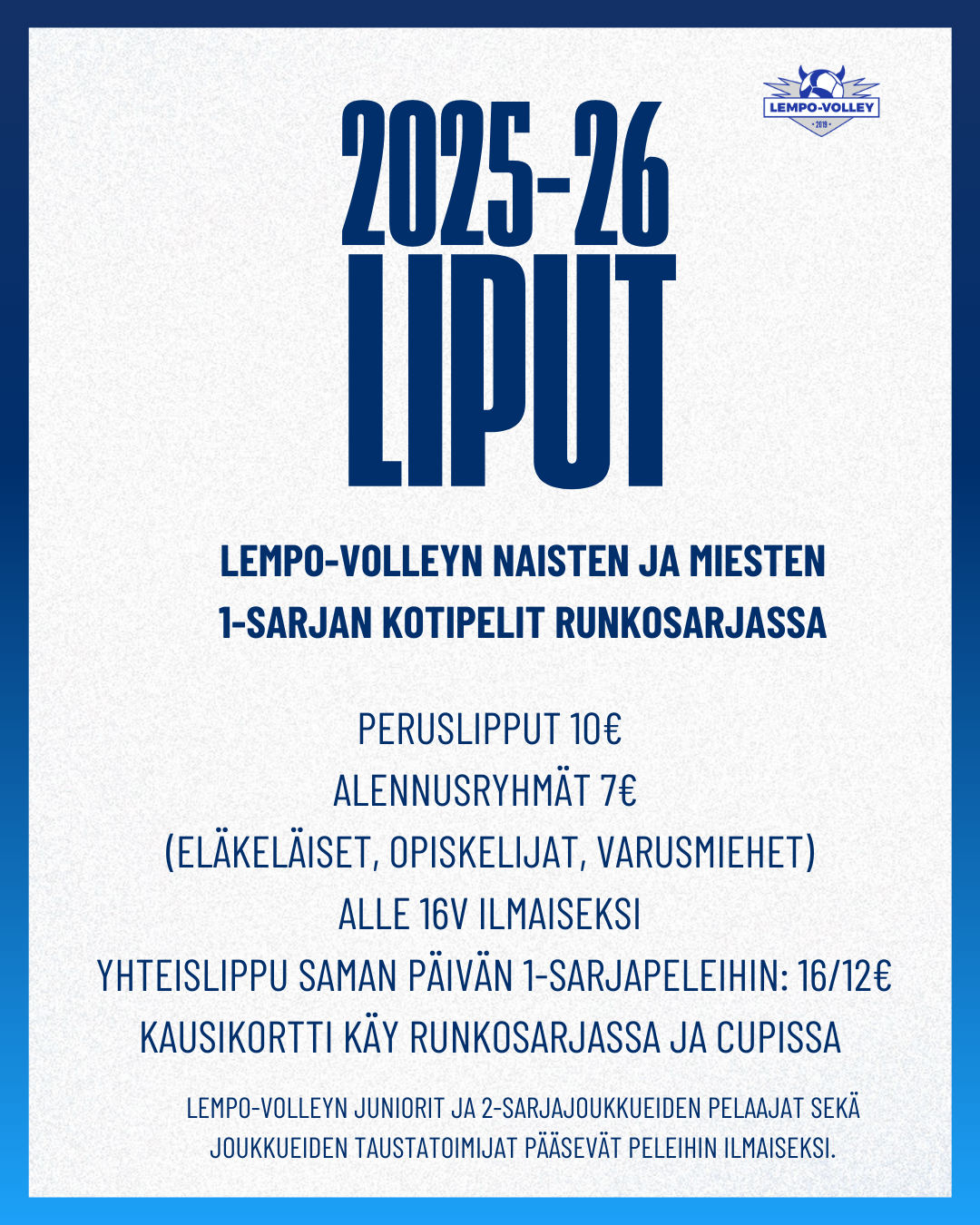 Pääsylippujen hinnat Lempo-Volleyn 1-sarjajoukkueiden kotiotteluissa 2025–26. RUNKOSARJA Peruslippu 10 € Alennuslippu 7 € (eläkeläiset, opiskelijat, varuspalvelusta suorittavat) Alle 16v ilmaiseksi…