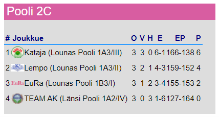 Tuloksena kaksi voittoa EuRasta ja Team AK:sta ja tappio Maskun Katajalle päätöspelissä, joka ratkaisi lohkovoiton.