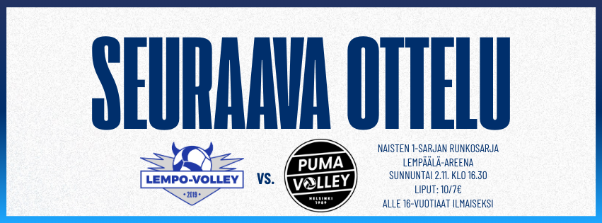 Lempo-Volley jatkaa naisten 1-sarjakauttaan ja hakee viidettä voittoaan putkeen sunnuntaina 2. marraskuuta kotikentällään, kun vastaan saapuu PuMa HVA eli PuMa-Volleyn valmennuskeskusjoukkue. Peli alkaa poikkeuksellisesti kello 16.30.