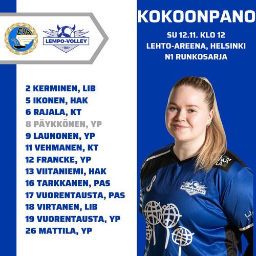 Lempo: Annastiina Tarkkanen, Adelia Launonen, Saara Rajala, Karoliina Viitaniemi, Roosa Päykkönen, Siiri Vehmanen ja libero Anna Kaisa Kerminen