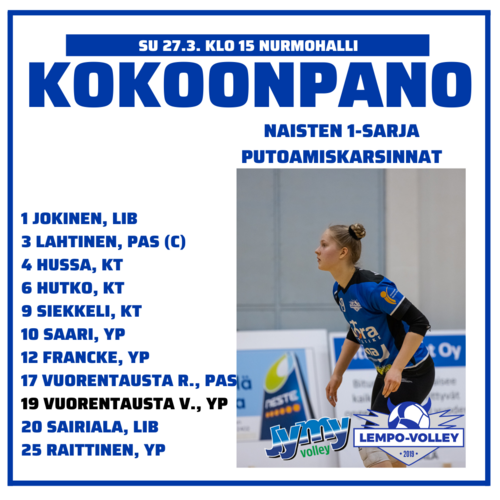 Lempo: Riikka Vuorentausta, Annika Saari, Veera Hussa, Veera Vuorentausta, Venla Raittinen, Milana Hutko ja libero Inka Sairiala