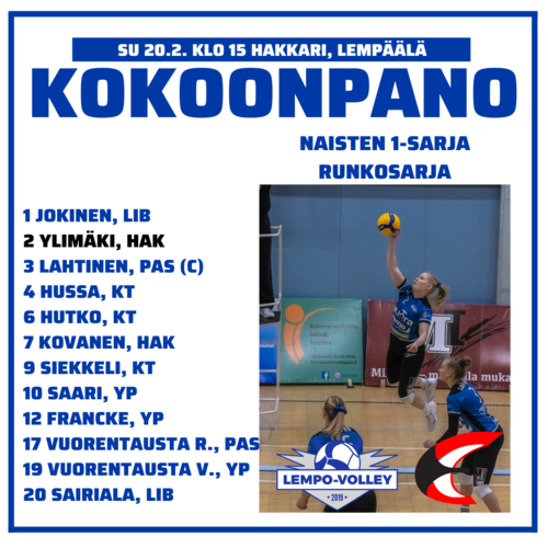 Molemmilla oli kokoonpanopuolella hieman vajetta. Lempolta puuttuivat runkopelaajista Viivi Huurne ja Sofia Ikonen, Kangasala-apu Venla Raittinen putos rivistä aamutreenien jälkeen. Mukana oli LP-libero Inka Sairiala. Ettalta puuttuivat Pirkanmaan-reissulta molemmat passarit ja passia heitti yleensä liberon paikalla nähty Melissa Karimies, joka selviytyi urakasta hienosti.