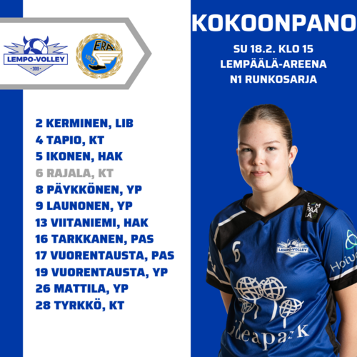 Lempo: Riikka Vuorentausta, Adelia Launonen, Saara Tyrkkö, Karoliina Viitaniemi, Roosa Päykkönen, Saara Rajala ja libero Anna Kaisa Kerminen