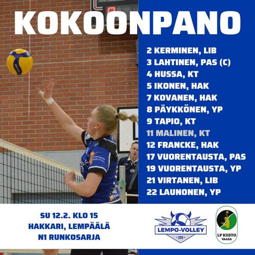Lempo-Volley laittoi näytöstyyliin romukoppaan neljän ottelun tappioputkensa naisten 1-sarjassa sunnuntaina. Lempo palasi kotikentälleen Hakkariin tyylillä ja voitti sarjakolmosen Vaasan Kiiston 3–0 (25–19, 25–23, 25–14). Voitto oli Lempolle kauden ensimmäinen suoraan kolmessa erässä.