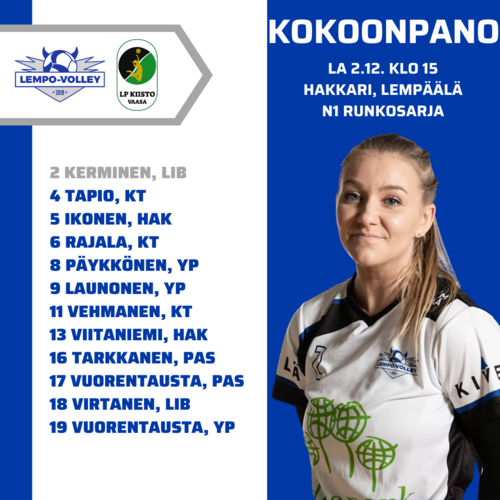 Lempo: Annastiina Tarkkanen, Roosa Päykkönen, Siiri Vehmanen, Karoliina Viitaniemi, Adelia Launonen, Tiia Tapio ja libero Anna Kaisa Kerminen