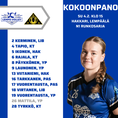 Lempo: Annastiina Tarkkanen, Adelia Launonen, Saara Rajala, Karoliina Viitaniemi, Veera Vuorentausta, Saara Tyrkkö ja libero Anna Kaisa Kerminen