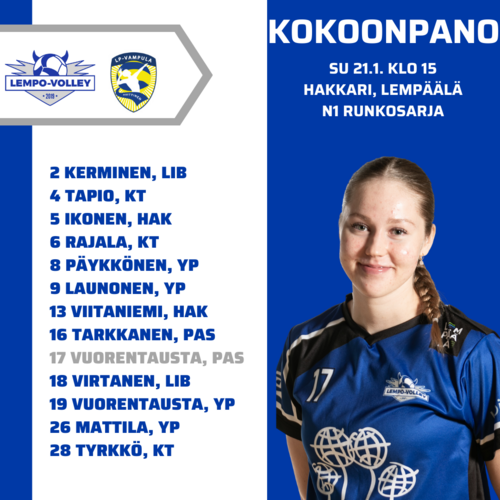 Adelia Launonen pelasi upean viikonlopun. Kahteen peliin 32 pistettä, joista sunnuntaina 17 ja valinta pelin parhaaksi. Senni Virtanen pelasi liberona loistavasti etenkin puolustuspelissä ja keskipelaaja-Saarat Tyrkkö ja Rajala onnistuivat erinomaisesti. Lempon tehokkain oli 18 pisteen hakkuri Karoliina Viitaniemi, passari Riikka Vuorentausta jakoi palloja monipuolisesti hyviin lyöntipaikkoihin läpi iltapäivän.