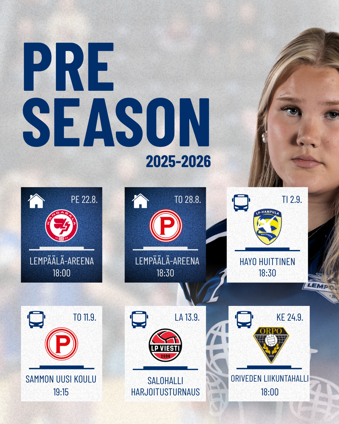 Lempo-Volleyn naisten 1-sarjajoukkue pelaa viisi virallista harjoitusottelua sekä yhden harjoitusturnauksen valmistautumisjaksollaan eli pre seasonilla kohti uutta 1-sarjakautta. Uusi sarjakausi alkaa lokakuussa.