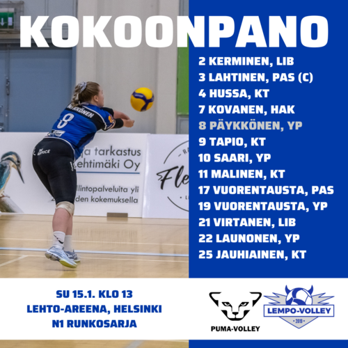 Lempo-Volley lähti sunnuntaina 15. tammikuuta haastamaan sarjakärki PuMa-Volleyta Helsinkiin. Alussa näytti, että matka jäisi pelkäksi haastamiseksi, mutta Lempo yltyi iltapäivän edetessä upeaan taisteluun voitosta.