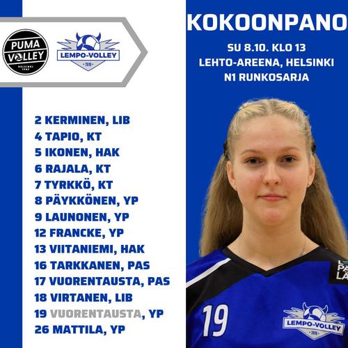 Lempo: Annastiina Tarkkanen, Adelia Launonen, Saara Tyrkkö, Karoliina Viitaniemi, Veera Vuorentausta, Tiia Tapio ja libero Anna Kaisa Kerminen