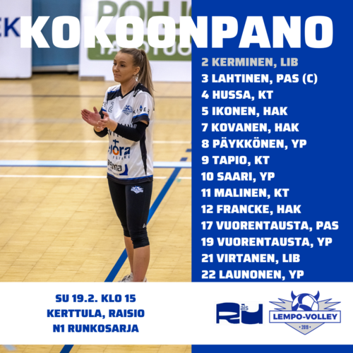 Lempo: Riikka Vuorentausta, Adelia Launonen, Veera Hussa, Pauliina Kovanen, Roosa Päykkönen, Linnea Malinen ja liberot Anna Kaisa Kerminen ja Senni Virtanen