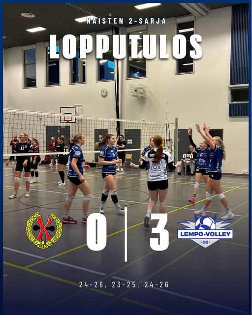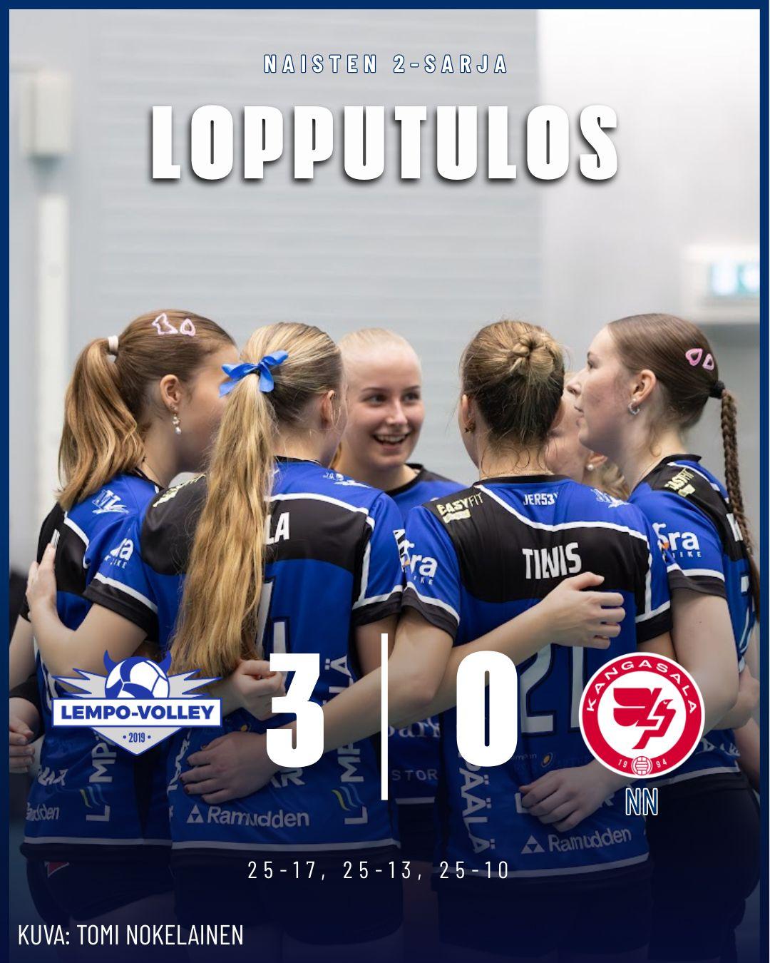 Lempo haki vierasvoiton Kangasalta selvin numeroin naisten 2-sarjassa sunnuntaina 23. marraskuuta: LP Kangasala NN - Lempo 0-3 (9-25, 12-25, 14-25).