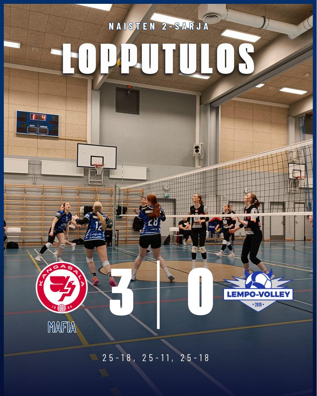 LP Kangasala Mafia oli sunnuntaina 8. helmikuuta etevämpi ja voitti Lempon naisten 2-sarjassa 3-0 (25-18, 25-11, 25-18) Kangasalla.