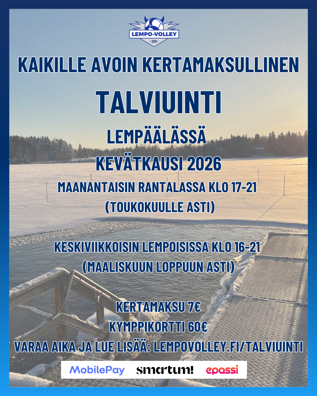 Lempo-Volleyn järjestämä kaikille avoin kertamaksullinen talviuinti eli avantouinti jatkuu myös kevätkaudella 2026.