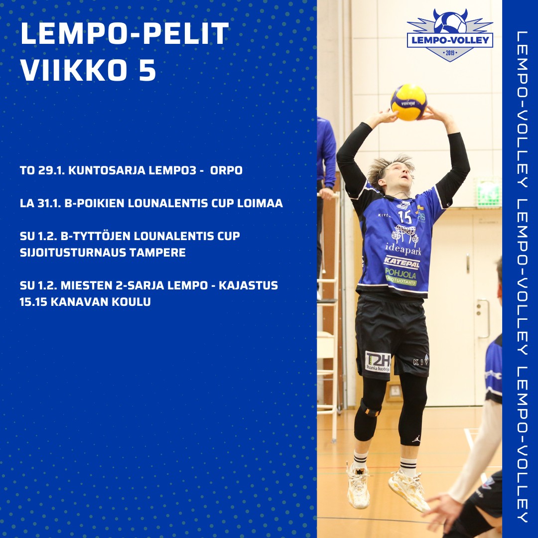 Tammikuisella viikolla Lempon D-tytöt Blue, miesten 2-sarja ja Kuntosarjan joukkueet pelaavat kotipelit. Muuten Lempolla onkin vieraspelejä ja -turnauksia Pirkkalassa, Kangasalla, Huittisissa,…