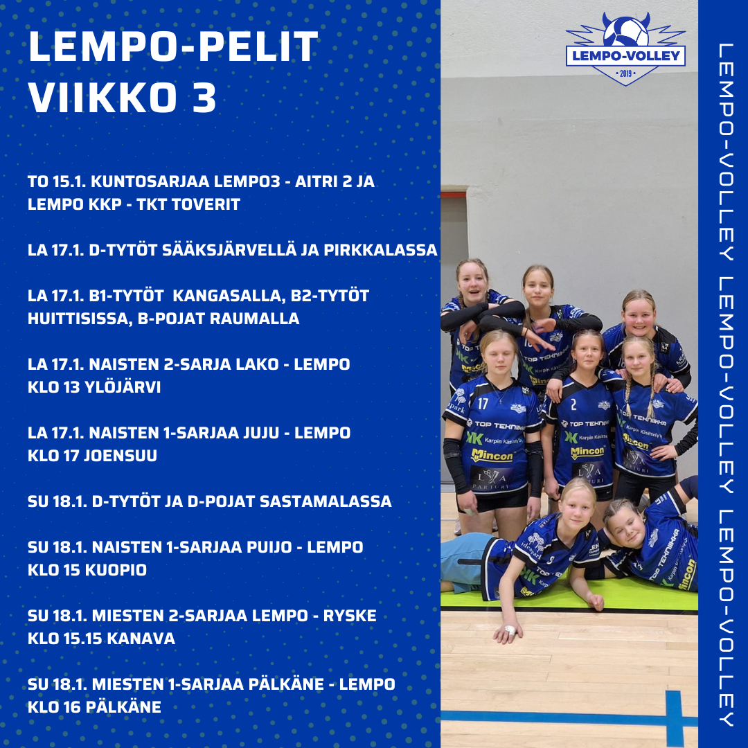 Tammikuisella viikolla Lempon D-tytöt Blue, miesten 2-sarja ja Kuntosarjan joukkueet pelaavat kotipelit. Muuten Lempolla onkin vieraspelejä ja -turnauksia Pirkkalassa, Kangasalla, Huittisissa,…