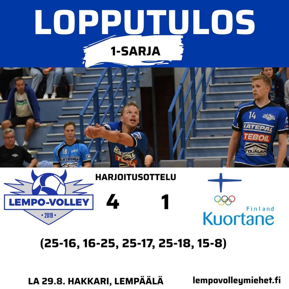 Lempo-Volley urakoi lauantaiaamun iloksi toisen treenipelinsä vuorokauden sisään. Lauantaina kaatui Kuortane eli Suomen alle 18-vuotiaiden maajoukkue erin 4–1 (25–16, 16–25, 25–17, 25–18, 15–8). Kuortane ei tullut täysin valmennuskeskusjoukkueellaan, muun muassa Veeti Nikkinen ei ollut mukana, vaan nuorten maajoukkueella, jonka piti pelata EM-kisoissa. Suomi kuitenkin perui osallistumisensa koronan vuoksi.