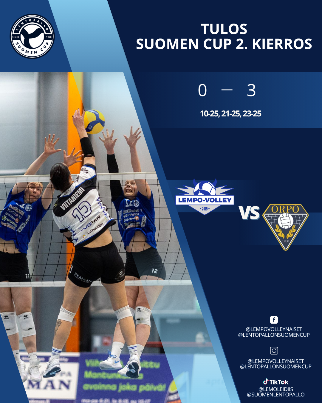 Lempo-Volleyn naisten 1-sarjajoukkueen Suomen Cupin taival päättyi perjantaina 7. marraskuuta kotikentällä Lempäälä-areenassa. Syyskauden herkkupalassa Lempo sai vieraakseen Mestaruusliigaa pelaavan Oriveden Ponnistuksen. OrPo oli 2. kierroksen otatuksessa odotetun kova ja näytti liigajoukkueen ja 1-sarjajoukkueen välisen tasoeron. OrPo eteni kolmannelle kierrokselle kahdeksan joukkoon voittamalla Lempon erin 3–0 (25–10, 25–21, 25–23).