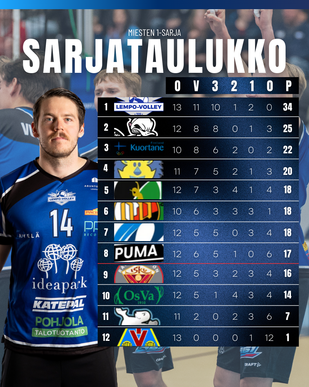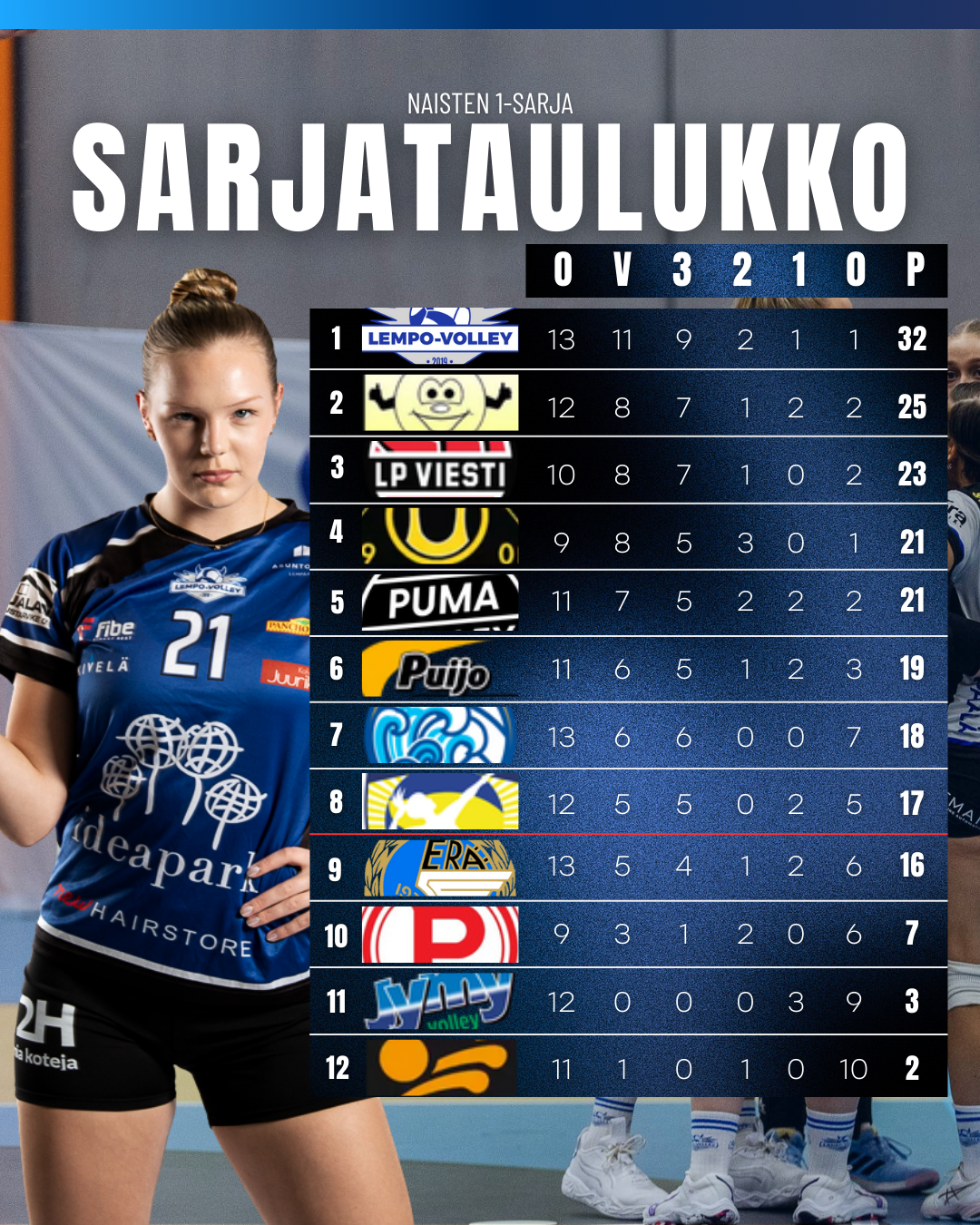 Kun vuosi 2026 alkaa, naisten ja miesten 1-sarjojen runkosarjassa kärkipaikalla on Lempo-Volley.