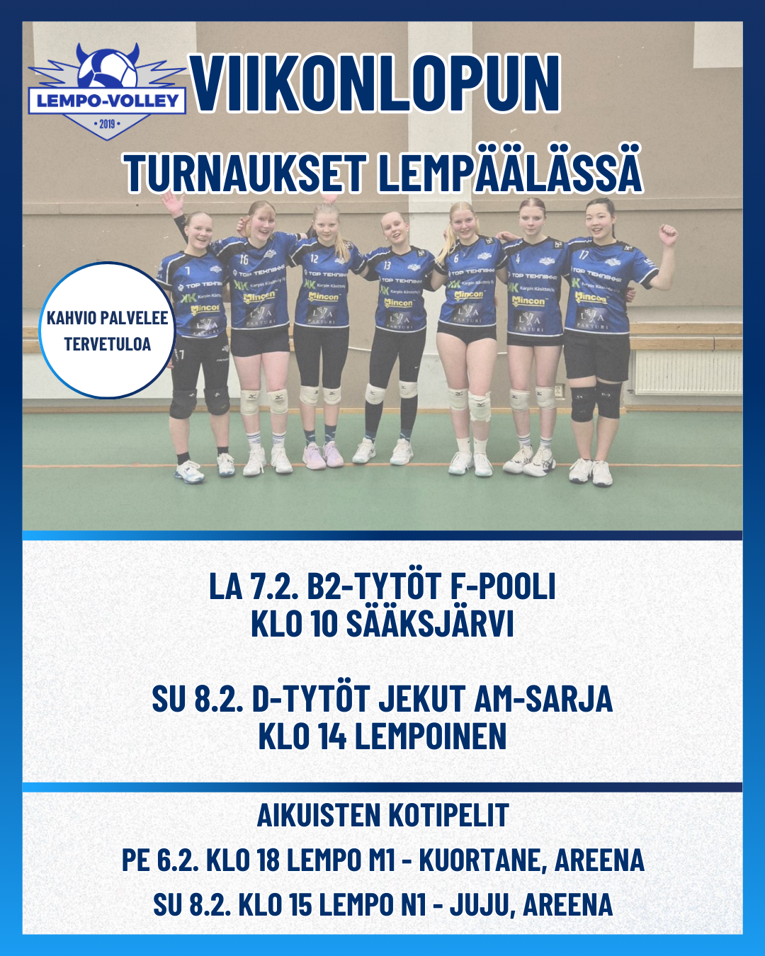 Lempo-Volleyn helmikuun ensimmäisellä viikolla pelataan runsaasti. Kaikki neljä aikuisjoukkuetta pelaavat ja junioreista pelivuorossa ovat B- ja D-juniorit.