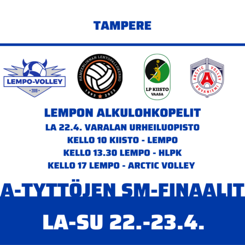 Lempo-Volley järjestää A-tyttöjen SM-finaalit lauantaina ja sunnuntaina 22.-23. huhtikuuta. Turnaus pelataan Tampereella Varalan urheiluopistolla ja Lempo puolustaa viime vuoden SM-pronssia. Turnaussivuille pääset täältä.